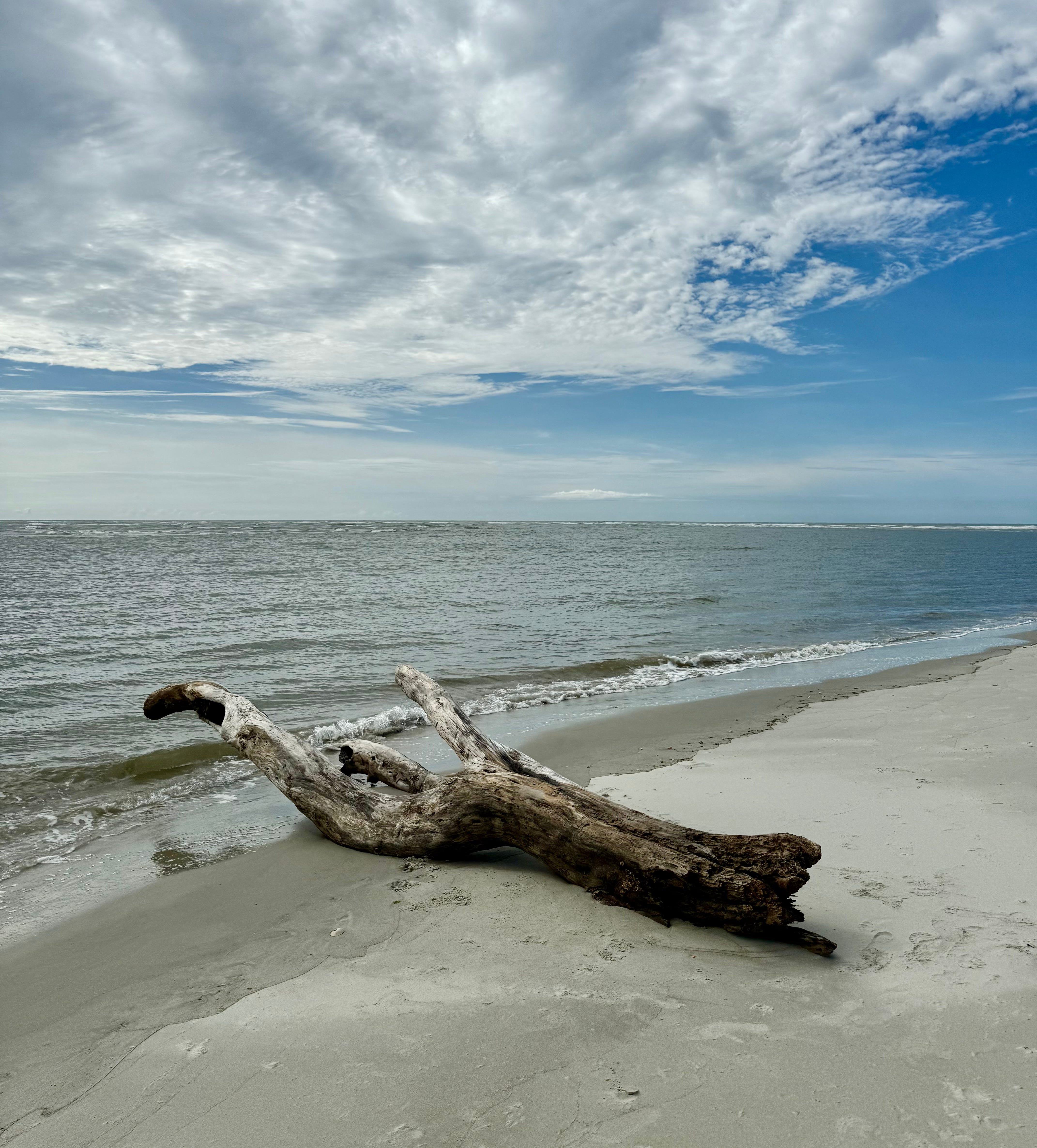 Take a trip with me to the ocean blue. You don't need shoes to follow, just your footprints in the sand, and a belief, that everything you think you know couldn't possibly be true. I walked along the biting water, gritty sand in my toes. Warm rain in the cool sunshine, driftwood in my way. I was so close to taking a fall but luckily I caught a seashelled wall (there are no walls on the beach). I'm always waiting on you to catch me instead of a dune. What lurks beneath where I swim down deep? It seems your lies so happily deceive. You told me clear jellyfish, brown stingrays, sharks, are the only creatures I will see. Then high tide came and an alligator swam by me (there are no alligators in the ocean). The breeze whispered and bellowed, it told me to cut the line from the tide to the strawberry moon so the water goes out rather than in. There is no ebb and flow (just ebb ebb ebb), it's like watching my life otherworldly, backward, in reverse. The beach is empty at sunset (this never happens). I don't understand what is real? I can't see through the lush marsh grasses. But I know there is a boat on the horizon, it's upside down, and the sky is under the sea. I try but I'll never make it there. And somehow this truth feels like salty relief. Now ride your bike with me, you still have your memory. Dodging cratered tide pools on this joyride where nothing is as it seems. (This isn't a dream). There are spaceship clouds and your dark sounds that I can see. Isn't everything virtual reality? Take a trip with me, to the ocean blue, you don't need shoes to follow, just your footprints in the sand, and a belief that everything you dream could possibly be true.
